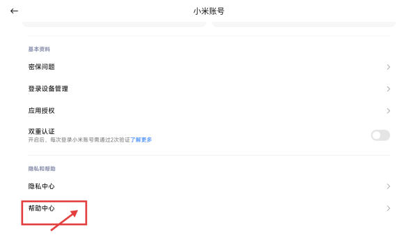3、在小米賬號(hào)頁面,點(diǎn)擊幫助中心選項(xiàng),進(jìn)入小米賬號(hào)幫助中心頁面。