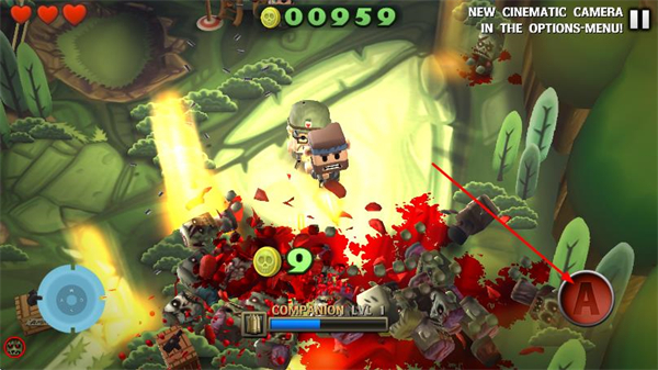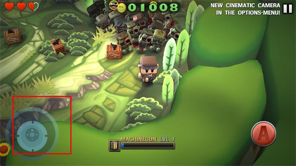 1、使用左側虛擬搖桿控制角色在場景中移動,躲避僵尸攻擊并調(diào)整戰(zhàn)斗位置。