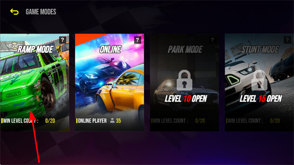 2、選擇RAMP MODE游戲模式,這是體驗(yàn)特技賽車的核心操作,選擇后可參與坡道特技挑戰(zhàn),積累關(guān)卡進(jìn)度。