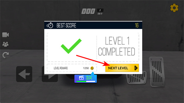 4、關(guān)卡完成后點(diǎn)擊NEXT LEVEL按鈕,這是推進(jìn)游戲進(jìn)程的基礎(chǔ)操作,點(diǎn)擊后可進(jìn)入下一關(guān),挑戰(zhàn)賽車特技。