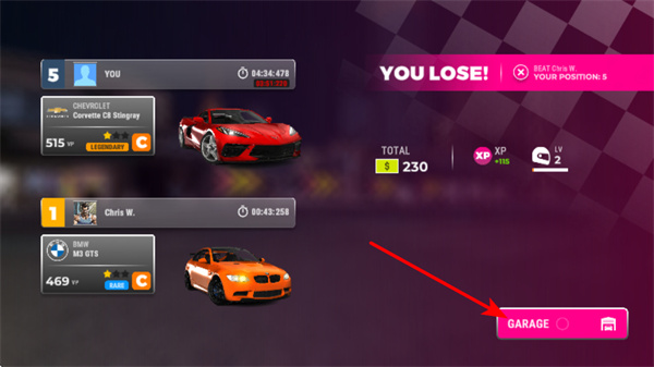 1、比賽失利后點擊GARAGE按鈕,這是調(diào)整賽車配置的關(guān)鍵操作,點擊后可進入車庫界面,進行升級更換。