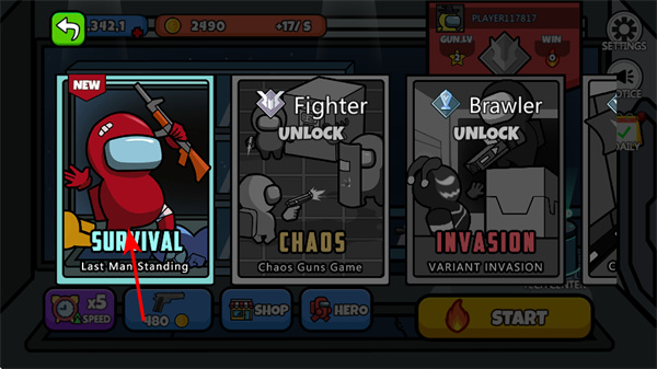 1、在模式選擇界面,可選擇SURVIVAL模式,該模式為Last Man Standing玩法,能體驗(yàn)獨(dú)特的生存競技。