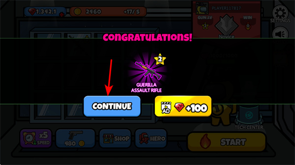 2、獲得獎勵后,點(diǎn)擊CONTINUE按鈕可繼續(xù)游戲進(jìn)程,也可選擇看廣告獲取額外鉆石獎勵,需求選擇操作。
