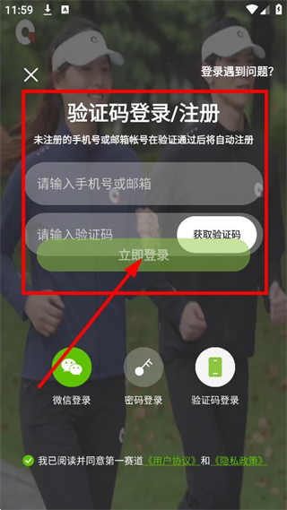 4、在驗(yàn)證碼登錄/注冊(cè)頁(yè)面,輸入手機(jī)號(hào)或郵箱,輸入驗(yàn)證碼后立即登錄,完成賬號(hào)登錄。