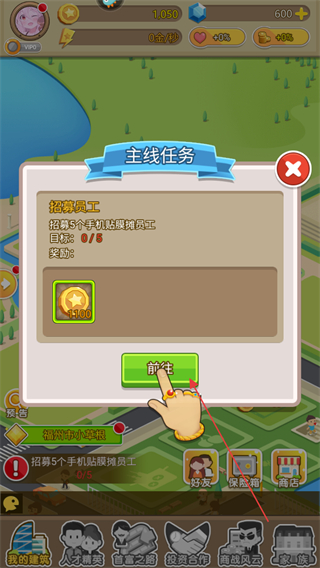1、完成主線任務(wù)招募5個手機貼膜攤員工,點擊前往推進任務(wù),完成后獲取金幣獎勵。