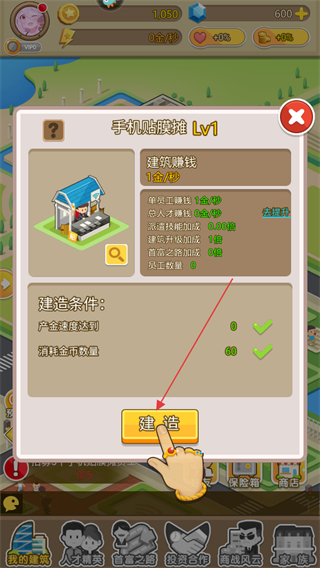 2、滿足建造條件產(chǎn)能速度、消耗金幣數(shù)量,點擊建造手機貼膜攤建筑,開啟賺錢途徑。
