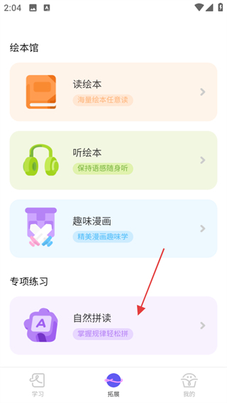 2、在拓展功能頁面,點擊自然拼讀可進入自然拼讀學(xué)習(xí)頁面。