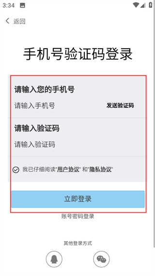 3、在登錄選擇頁面,輸入信息,同意協(xié)議后點擊立即登錄可完成賬號登錄。