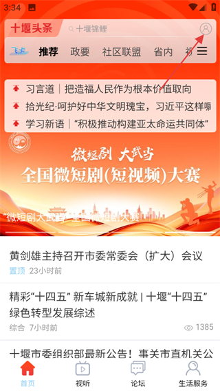 1、打開十堰頭條,點擊頁面右上角個人中心圖標,可進入個人中心頁面。