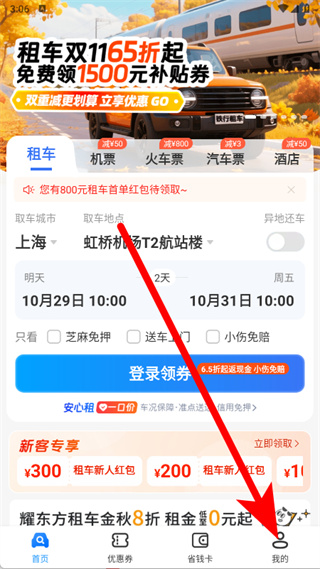 1、打開鐵行租車,點擊底部導航欄的我的,進入個人中心頁面。