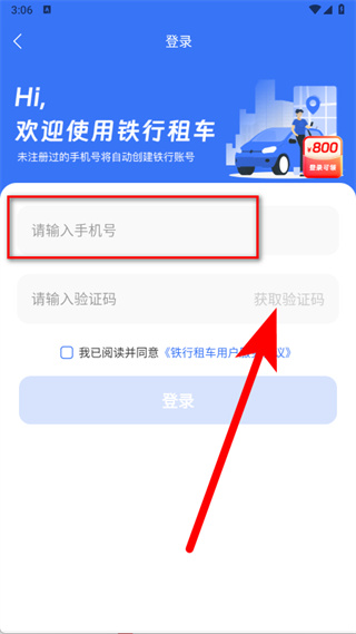 3、在登錄界面,輸入手機號碼,點擊獲取驗證碼。
