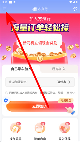 1、打開方舟行,點擊左上角菜單按鈕,展開側(cè)邊欄。