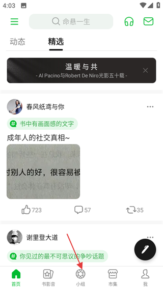 1、打開豆瓣,若想加入小組,在首頁點擊小組,可進入小組頁面。
