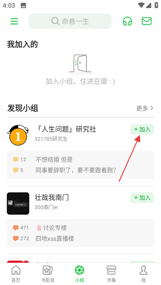 2、在小組頁面,點擊心儀小組的+加入,若未登錄進入登錄頁面。