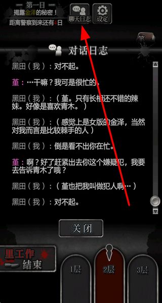 2、點(diǎn)擊聊天日志,仔細(xì)回顧與董、黑田等角色的對(duì)話(huà)內(nèi)容,從中挖掘關(guān)于金澤秘密的隱藏線(xiàn)索,梳理出劇情的發(fā)展脈絡(luò)。