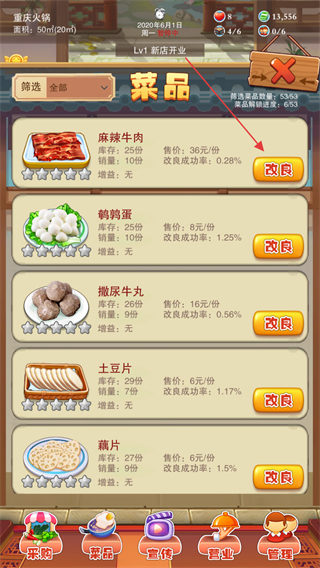 1、通過改良熱銷的菜品,提高售價,改良有一定的失敗風(fēng)險,每次改良都會花費(fèi)一定的金錢。