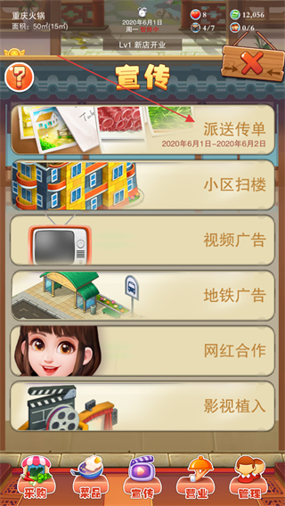 4、點(diǎn)擊下方的宣傳按鈕,選擇宣傳方式,不同的宣傳方式可以獲得等量的客流量。