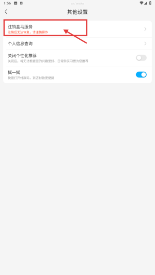 4、在其他設(shè)置頁面,點(diǎn)擊注銷盒馬服務(wù)選項(xiàng),發(fā)起賬號(hào)注銷操作。