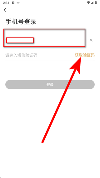 3、在登錄頁面中,輸入手機號碼,點擊獲取驗證碼。