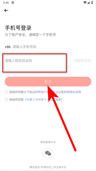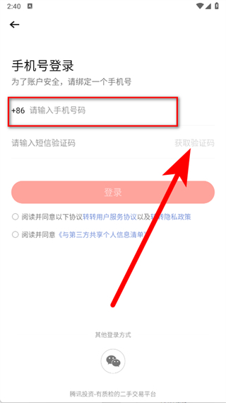 3、在登錄界面,輸入手機(jī)號(hào),點(diǎn)擊獲取驗(yàn)證碼。