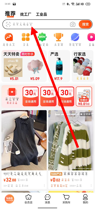 1、打開(kāi)1688批發(fā)網(wǎng),在首頁(yè)搜索框,輸入目標(biāo)商品關(guān)鍵詞,點(diǎn)擊搜索。