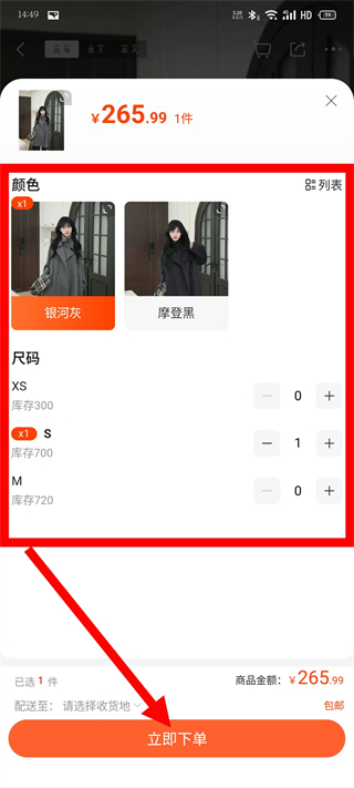 4、在商品詳情頁(yè),點(diǎn)擊立即購(gòu)買,選擇商品顏色、尺碼等規(guī)格。