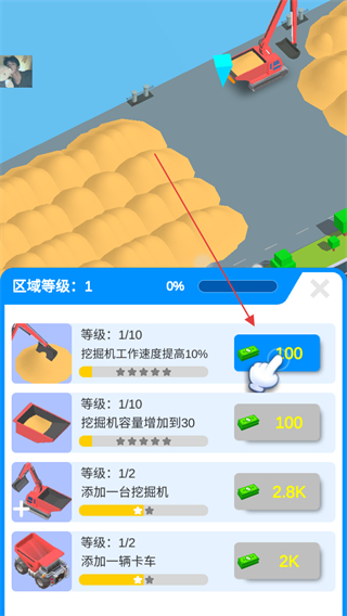 1、花費(fèi)金幣升級挖掘機(jī),如提升工作速度,增加區(qū)域等級進(jìn)度。