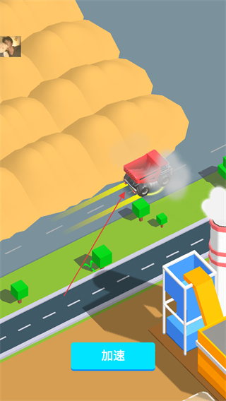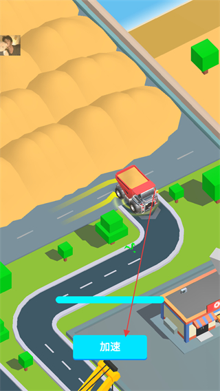 2、駕駛卡車運(yùn)輸沙土,點擊加速按鈕提升行駛速度,高效運(yùn)輸。