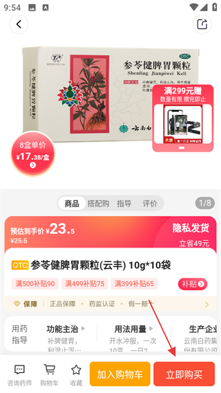 3、在藥品詳情頁面,點(diǎn)擊立即購買可進(jìn)入規(guī)格選擇頁面。