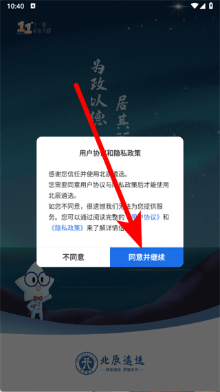 1、打開北辰遴選,在用戶協(xié)議和隱私政策彈窗中點擊同意并繼續(xù)。