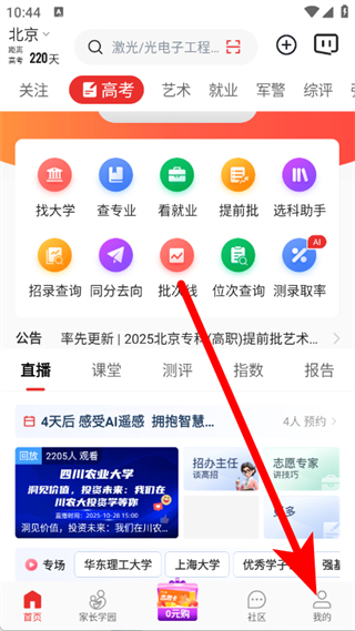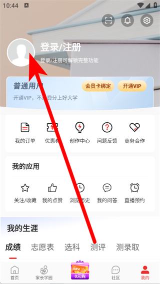 1、打開(kāi)優(yōu)志愿,點(diǎn)擊底部導(dǎo)航欄我的,進(jìn)入個(gè)人中心頁(yè)面。