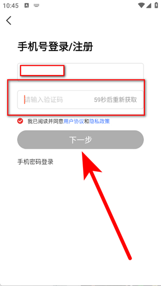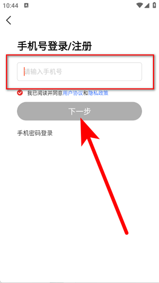 4、進(jìn)入登錄注冊(cè)頁(yè)面,輸入手機(jī)號(hào),勾選協(xié)議后,點(diǎn)擊下一步。