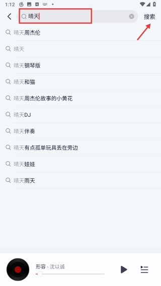 2、在搜索頁(yè)面輸入晴天,點(diǎn)擊搜索按鈕,進(jìn)入搜索結(jié)果頁(yè)面。