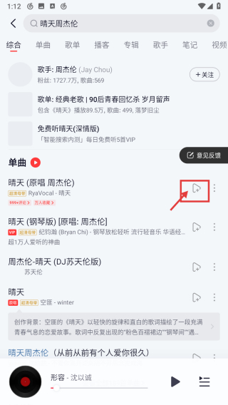 3、在搜索結(jié)果頁(yè)面,找到晴天原唱周杰倫的歌曲條目,點(diǎn)擊播放按鈕,進(jìn)入歌曲播放頁(yè)面。