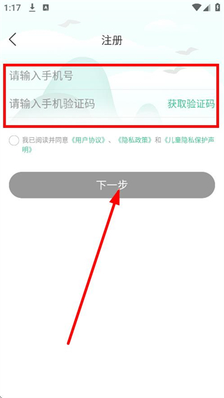 3、在注冊(cè)頁面,輸入手機(jī)號(hào),點(diǎn)擊獲取驗(yàn)證碼并輸入后點(diǎn)擊下一步。
