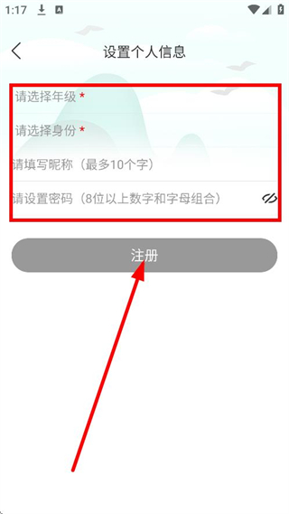 4、在設(shè)置個(gè)人信息頁面,填寫昵稱并設(shè)置密碼后點(diǎn)擊注冊(cè),完成賬號(hào)注冊(cè)操作。