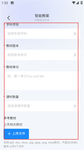 3、在智能教案設(shè)置頁(yè)面,填寫信息并上傳參考教材后,即可生成智能教案。