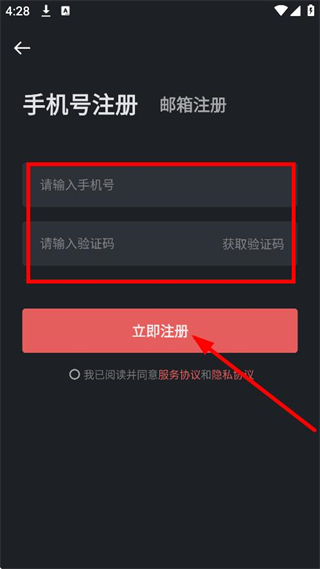 3、輸入手機(jī)號(hào),點(diǎn)擊獲取驗(yàn)證碼并輸入后點(diǎn)擊立即注冊(cè)。