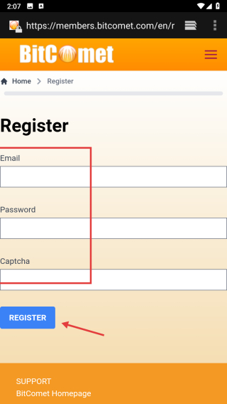 4、在注冊頁面填寫Email、Password和Captcha,點擊REGISTER按鈕,完成會員注冊操作。