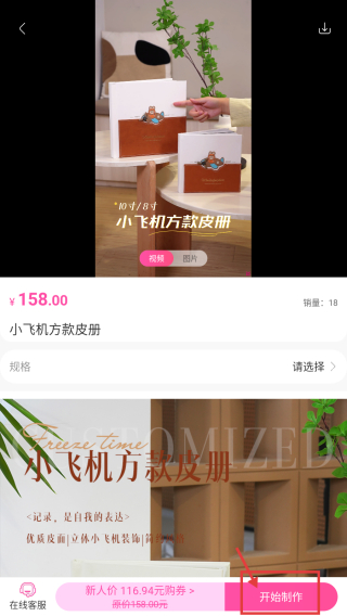 4、在商品詳情頁,點擊開始制作按鈕,啟動皮冊定制流程。