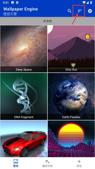 1、打開(kāi)Wallpaper-Engine-APP,點(diǎn)擊頂部排序圖標(biāo),展開(kāi)排序選項(xiàng)菜單。