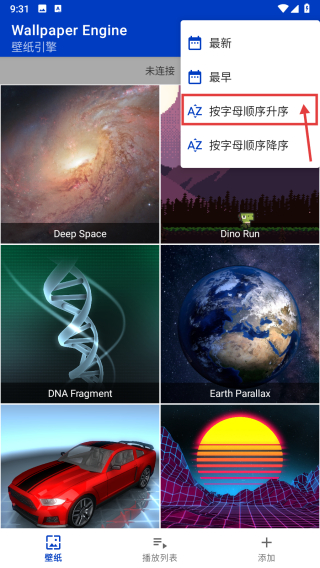 2、在排序選項(xiàng)中,選擇按字母順序升序,調(diào)整壁紙列表排序方式。