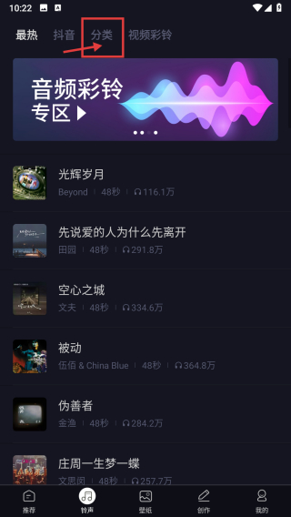 2、在鈴聲板塊頁(yè)面,點(diǎn)擊分類選項(xiàng),查看鈴聲分類列表。