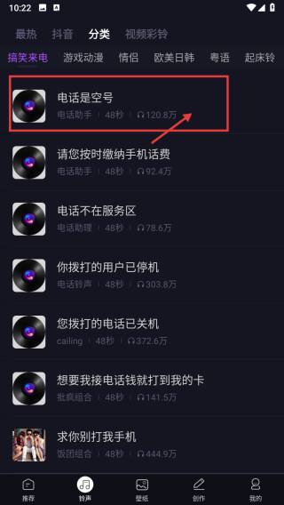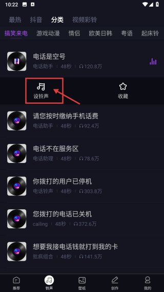 3、在鈴聲分類列表中,點(diǎn)擊電話是空號(hào)鈴聲條目,進(jìn)入鈴聲操作頁(yè)。