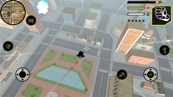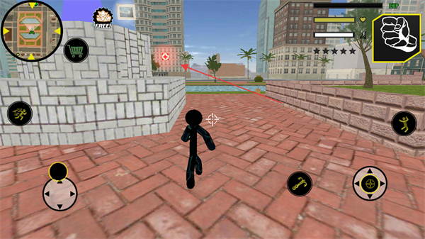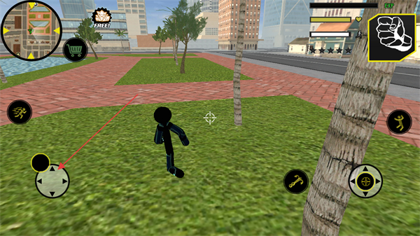 1、操控黑鋼火柴人在城市中移動(dòng),利用左側(cè)虛擬搖桿探索不同區(qū)域,如公園、街道等。