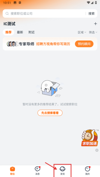1、打開求職類APP,點擊底部發(fā)現(xiàn)選項,進入發(fā)現(xiàn)板塊頁面。
