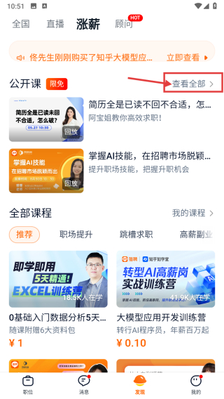 3、在漲薪頁面,點擊公開課右側的查看全部按鈕,進入公開課列表頁。