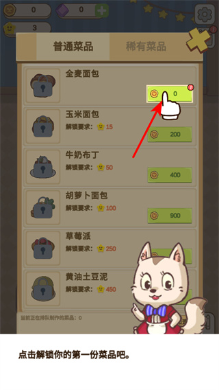 3、在菜品解鎖界面,點(diǎn)擊全麥面包的解鎖按鈕,消耗資源解鎖第一份菜品,為店鋪經(jīng)營(yíng)開啟菜品供應(yīng)的第一步。