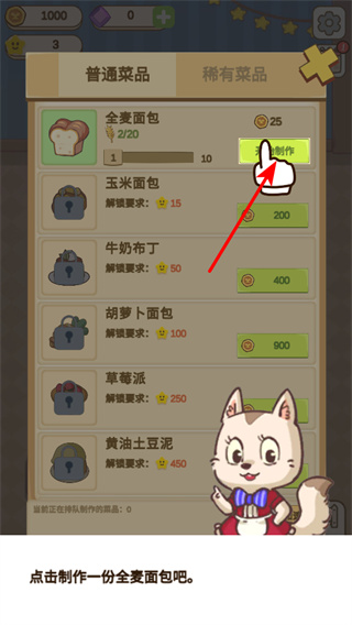 4、解鎖菜品后,點(diǎn)擊制作按鈕,可開始制作全麥面包,通過制作菜品獲取收益,同時(shí)提升店鋪的運(yùn)營(yíng)等級(jí)。