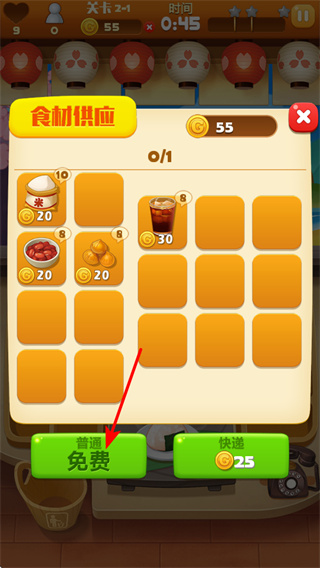 4、當食材不足時,進入食材供應界面,點擊免費按鍵可獲取食材,保障點心制作的食材供應,確保關卡順利推進。